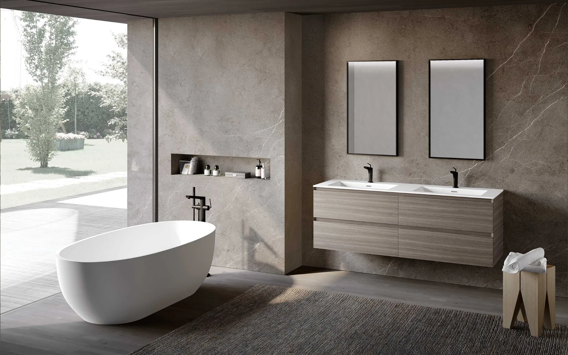 Arreda il tuo bagno moderno alla perfezione con Block System Syntesi C32, mobili bagno sospesi e accessori in melaminico di Baxar.