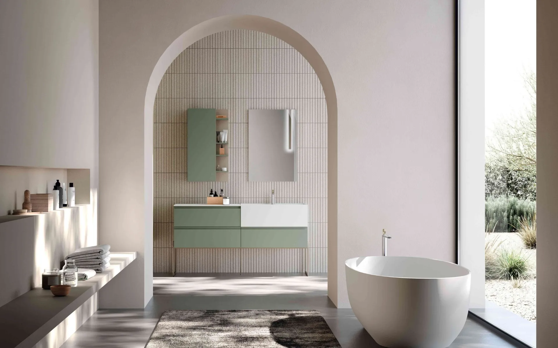 Arreda la stanza del benessere moderno alla perfezione con M1 System 143, mobili bagno sospesi e oggetti in laccato opaco di Baxar.