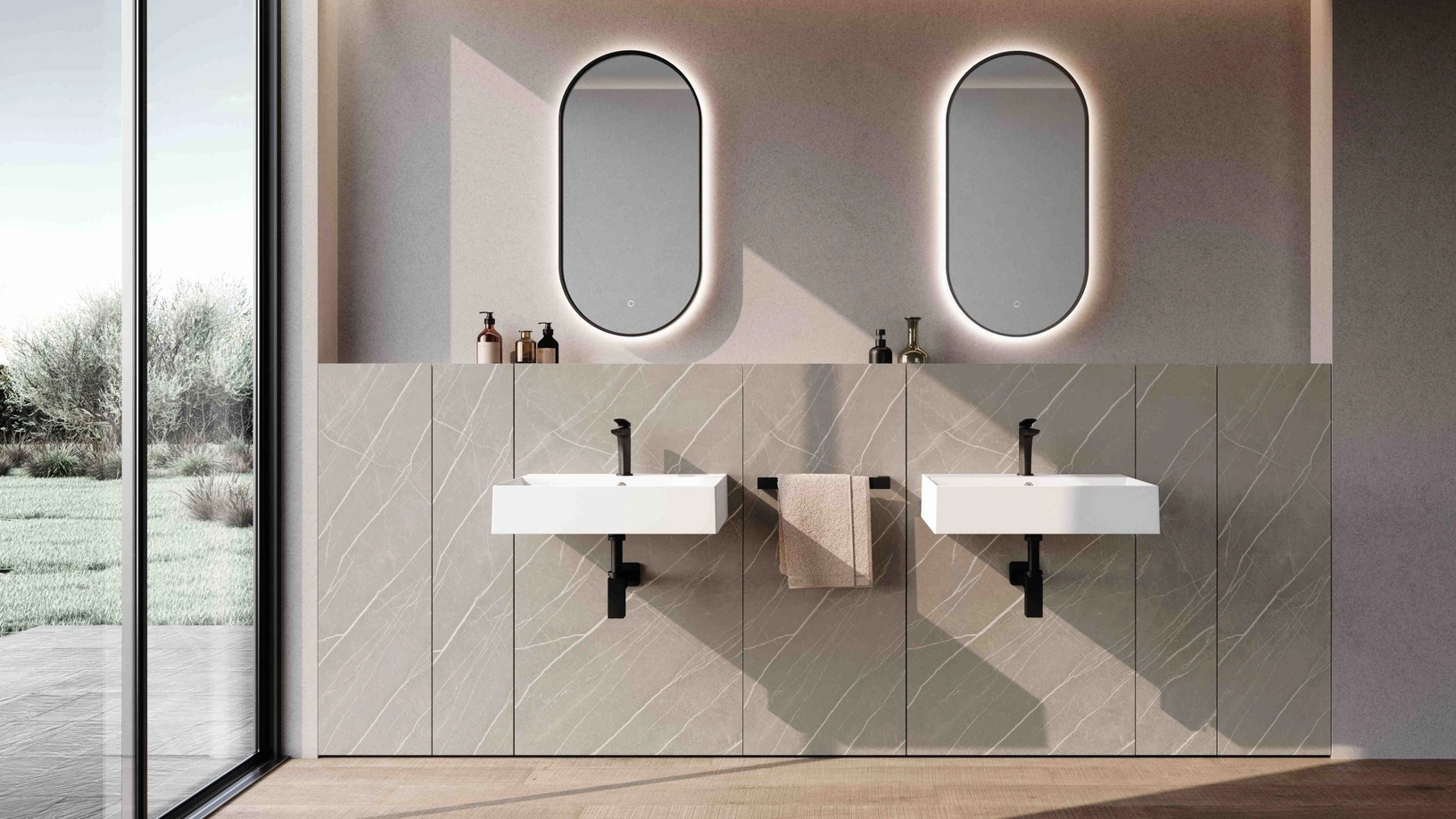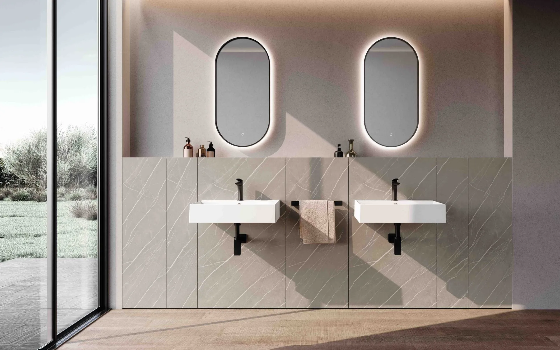 mobili bagno a terra M2 System 243 di Baxar: scopri l'Arredo Bagno in HPL moderno e arreda la stanza del benessere.