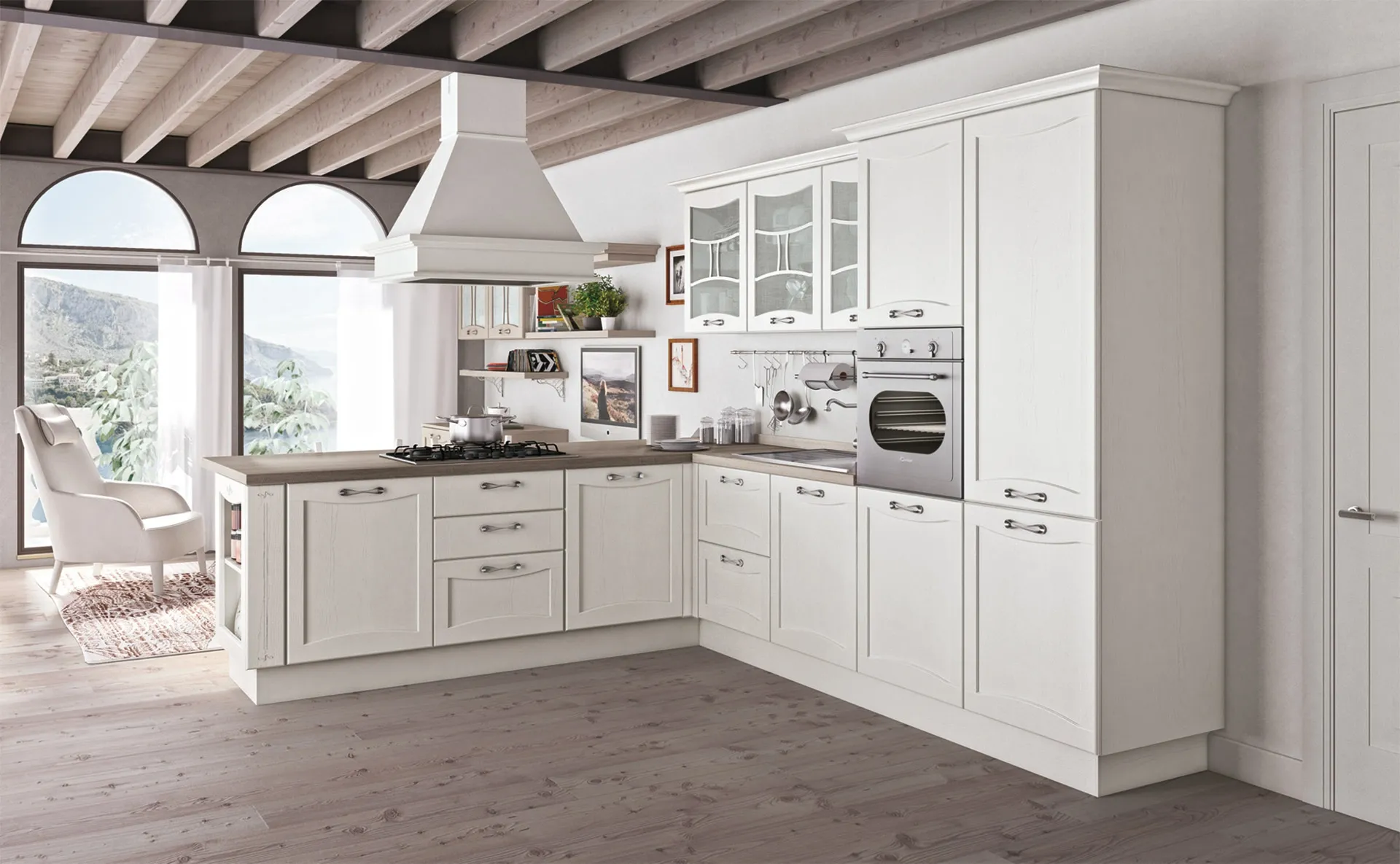 Se vuoi una cucina classica, clicca e scopri di più sul modello Aurea con penisola Creo.