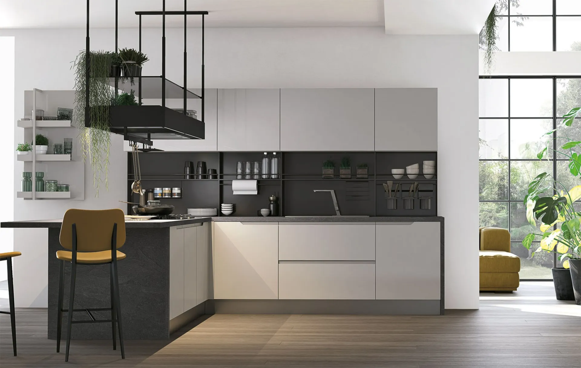 Cucina Moderna con penisola Luna 02 di Lube: linee decise e progettualità su misura connotano tutte le proposte del brand