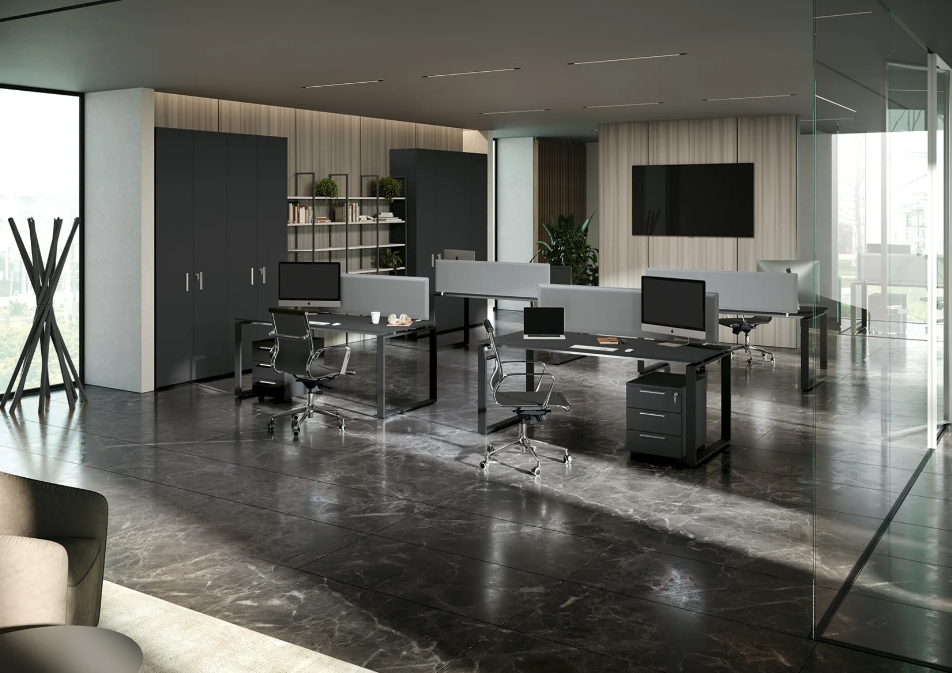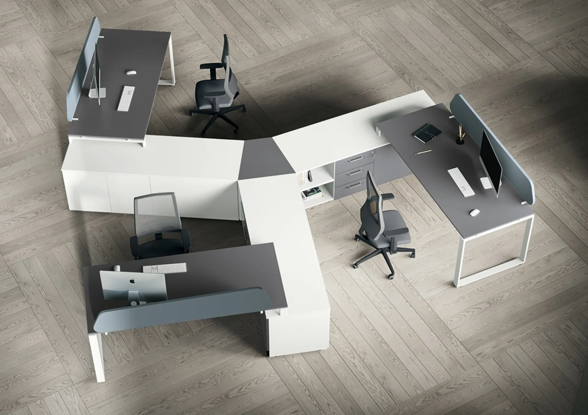 Cerchi Arredo Ufficio dei migliori brand? Scopri le differenti soluzioni di scrivanie operative in melaminico, come il modello Loft Operativa Anello Chiuso di Colombini Office.